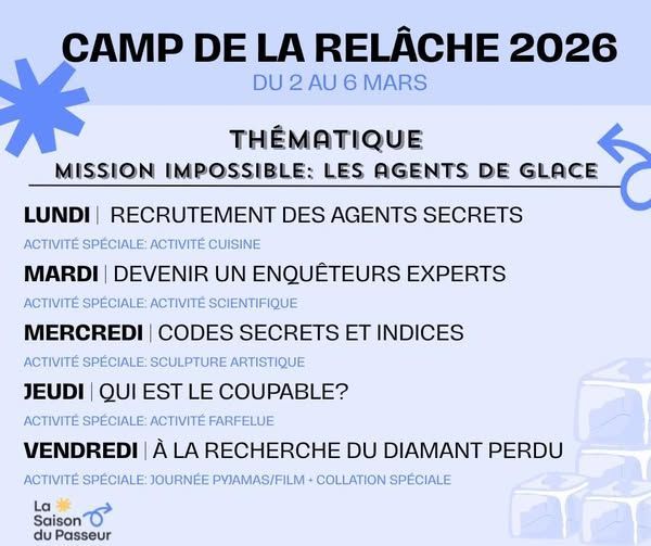 La semaine de relâche approche à grands pas ! Du lundi 2 mars au vendredi 6 mars, La Saison du Passeur sera de retour avec le camp de la Relâche. Une super programmation attend vos enfants!