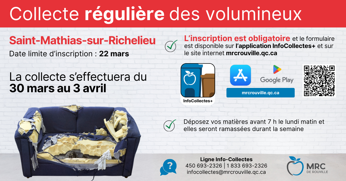 Pour vous inscrire ou pour consulter la liste des matières admissibles, rendez-vous au mrcrouville.qc.ca/au-service-des-citoyens/environnement/collecte-des-residus-volumineux.