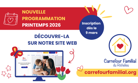 La session du printemps du Carrefour Familial du Richelieu débute le 31 mars ! Viens vivre un moment riche en découvertes en famille : activités parents-enfants, ateliers pour les parents, et bien plus encore.