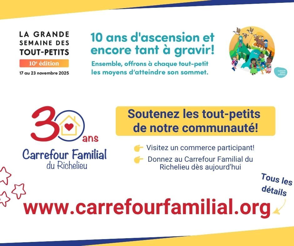 Le Carrefour Familial du Richelieu s’associe à la 10e édition de la Grande semaine des tout-petits qui aura lieu du 17 au 23 novembre 2025.