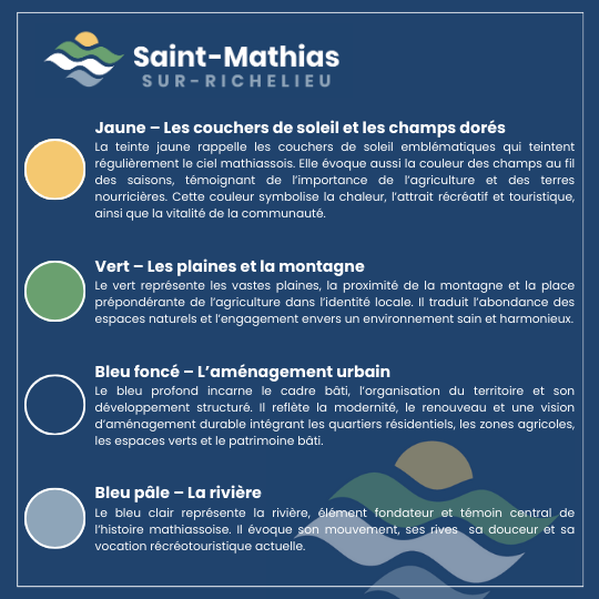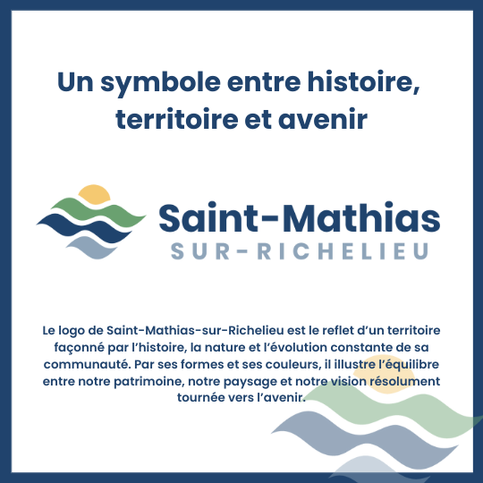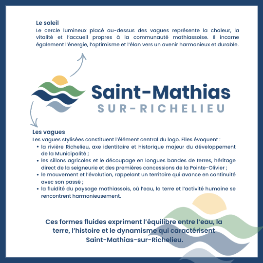 Le soleil évoque la chaleur et la vitalité de la communauté, tandis que les vagues représentent la rivière, les sillons agricoles et le mouvement du territoire. Ces éléments reflètent l’équilibre entre l’histoire, le paysage et le dynamisme qui caractérisent Saint-Mathias-sur-Richelieu.