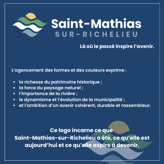 Le nouveau logo est le fruit d’une réflexion approfondie menée par la Municipalité afin de moderniser son image, de mieux représenter ce que Saint-Mathias-sur-Richelieu a été, ce qu’elle est aujourd’hui et ce qu’elle aspire à devenir.